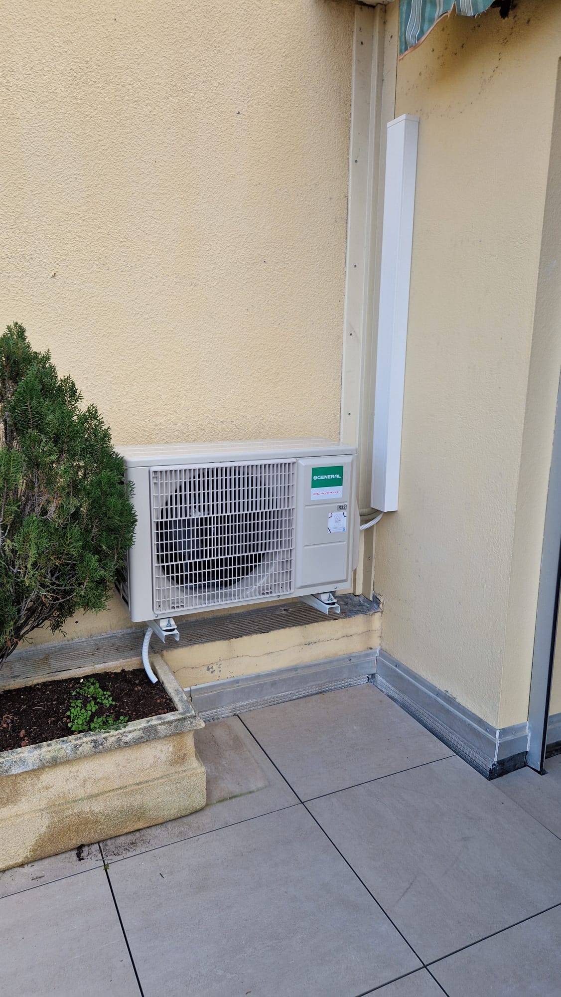L’installation repose sur une climatisation monosplit Général Fujitsu, reconnue pour sa fiabilité et son efficacité énergétique. Le système comprend un groupe extérieur Inverter Général Fujitsu référence G-ASHH14KMCG.UE associé à une unité intérieure murale G-ASHH14KMCH.UI. Cette configuration permet de traiter efficacement le séjour tout en conservant une installation discrète et compacte.