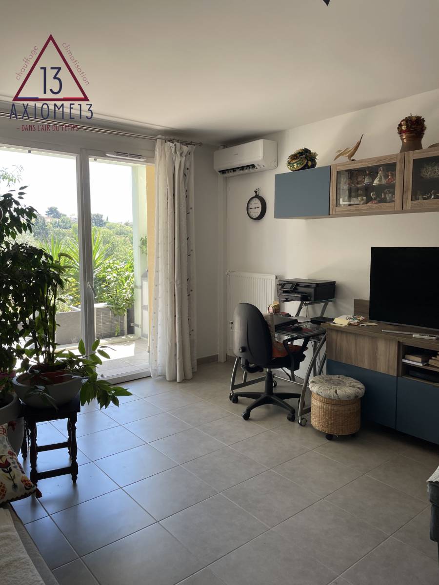Axiome13, entreprise familiale de chauffage et climatisation, basée à Auriol, vous propose ici l'installation d'une climatisation réversible murale de marque Mitsubishi pour le séjour d'un appartement de 35m2 sur la jolie commune d'Allauch.