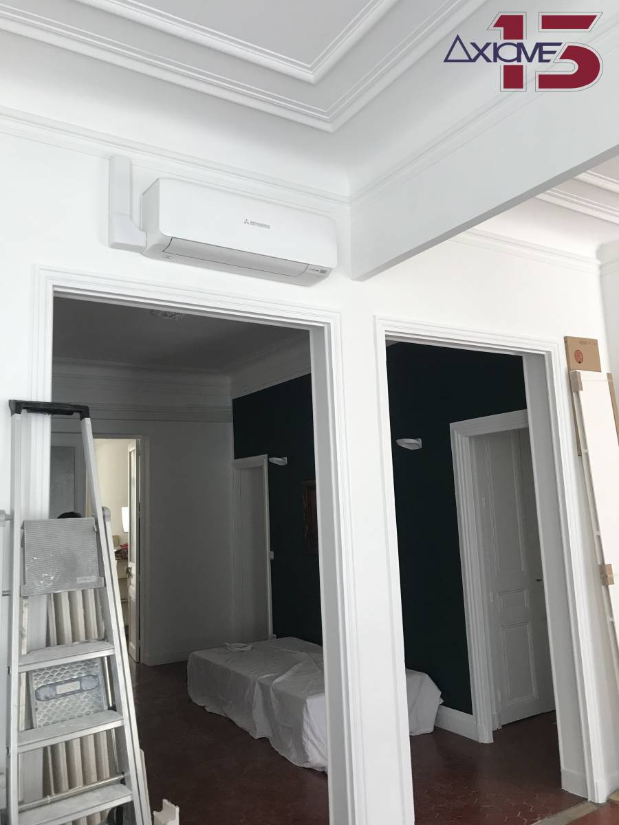 Dans cet appartement de 50m², nous avons installé trois unités murales Mitsubishi, toutes reliées à un seul groupe extérieur multisplit Inverter réversible. Ce type de groupe permet, en cas de limitation d'espace extérieur, d’installer plusieurs unités intérieures sur un même appareil, optimisant ainsi l'espace et l'efficacité énergétique.