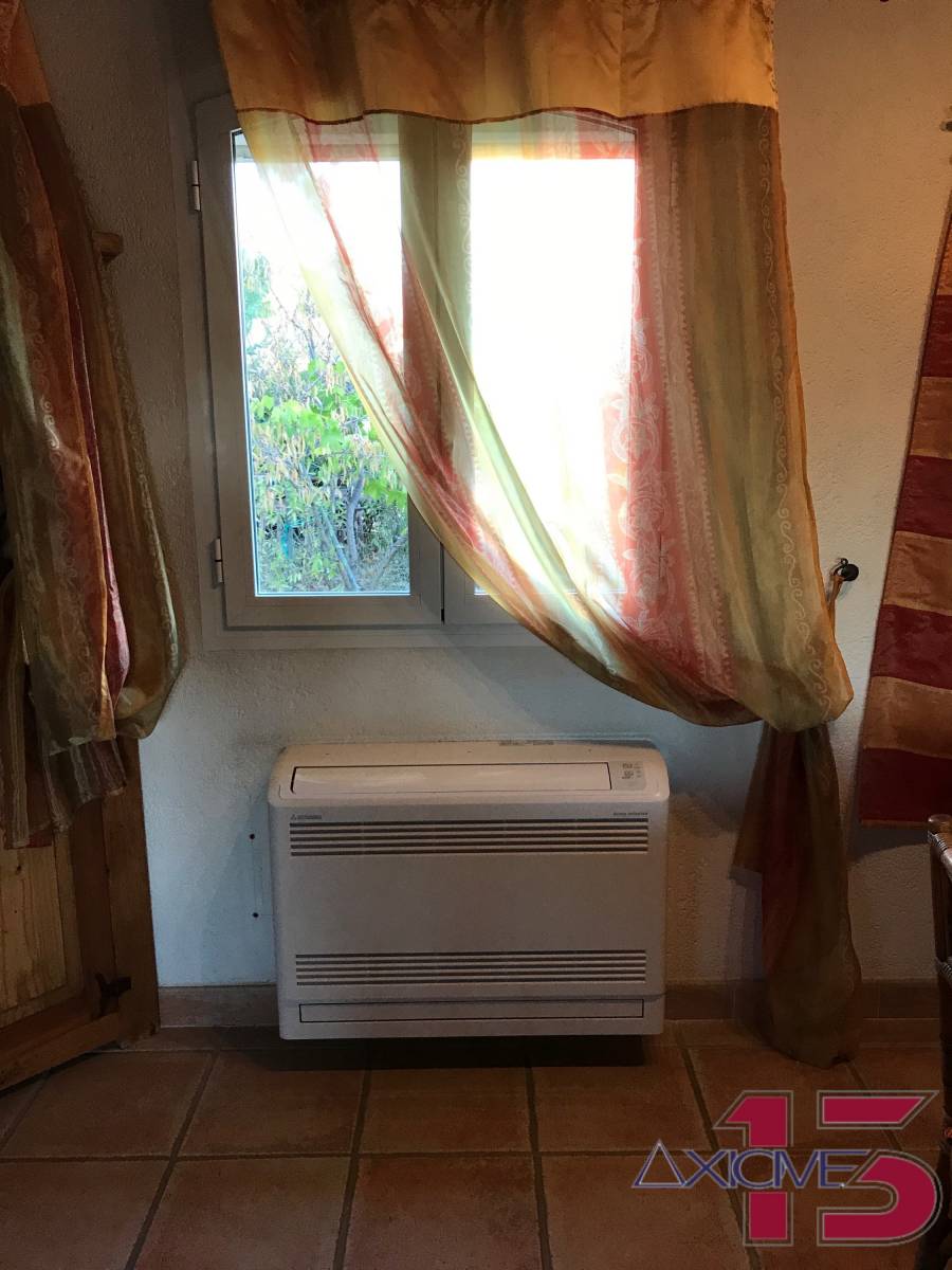 L'installation réalisée dans ce salon de 50m2 est une climatisation réversible type console de marque Mitsubishi.