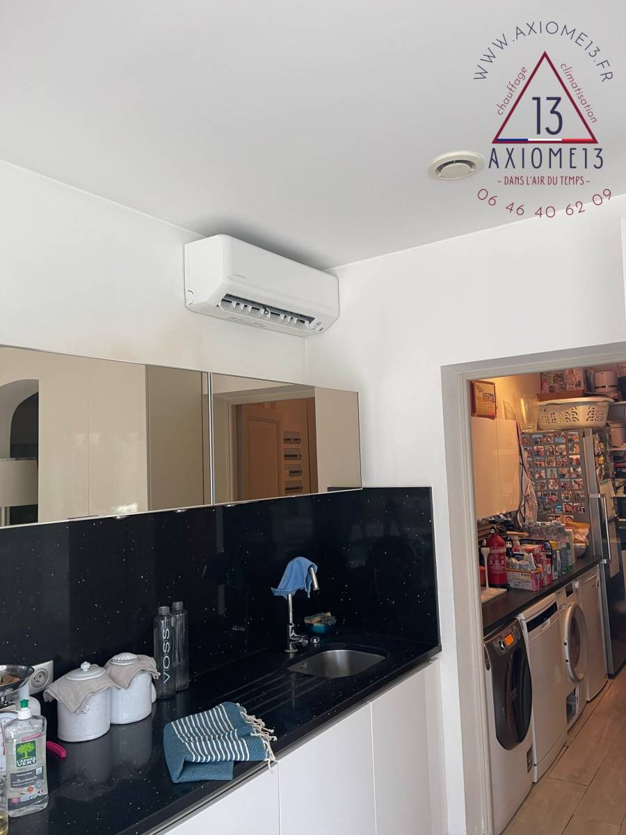 Axiome13 a récemment réalisé l’installation d’une climatisation réversible inverter monosplit Mitsubishi dans une cuisine ouverte sur séjour à Auriol (13). Ce projet avait pour objectif d’améliorer le confort thermique en complétant un appareil déjà installé dans le séjour, mais dont la puissance ne suffisait pas à traiter l’ensemble de la pièce.