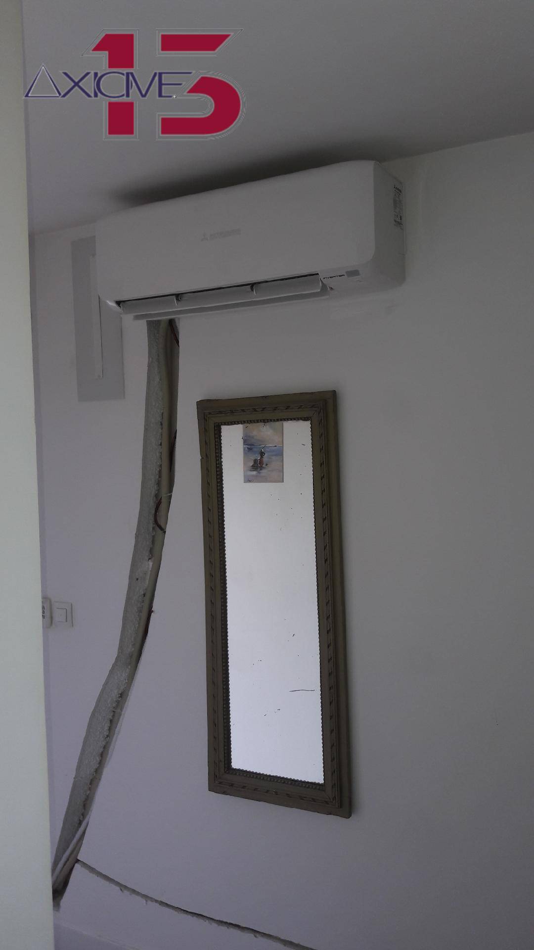 La pompe à chaleur, ici, type murale, a été installée sur une terrasse en passant sous les dalles en bois. Une fois à l'intérieur, nous avons fait une saignée (rebouchée ensuite) dans le mur en placo afin de faire passer les liaisons frigorifiques jusqu'à l'unité intérieure, de