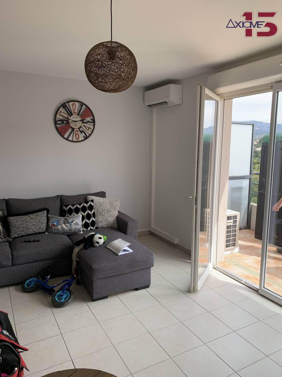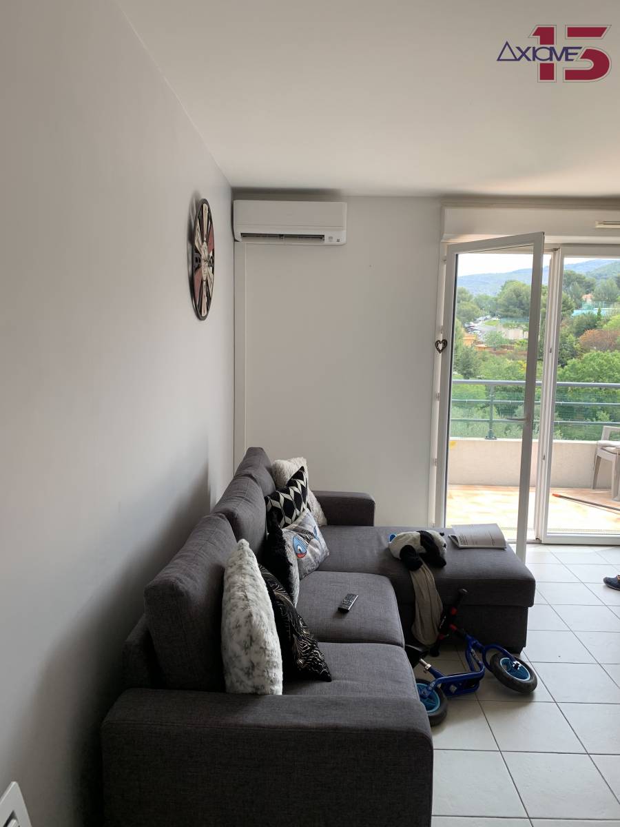 l-La climatisation réversible installée dans appartement, d'une puissance de 3,5Kw a été disposée dans le séjour de 30m2. Le groupe extérieur a été, quant à lui, posé sur des plots anti vibration afin d'éviter les possibles nuisances sonores.